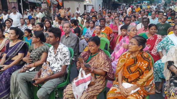 বিজেপি প্রার্থী পূর্ণিমা চক্রবর্তী প্রচার মঞ্চে–সুপারস্টার মিঠুন চক্রবর্তী।