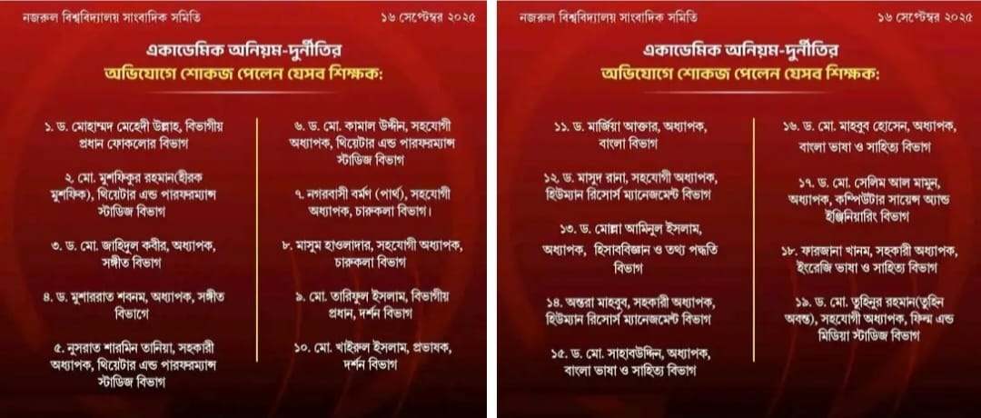 শোকজ নোটিশ পাওয়া শিক্ষকরা হলেন- ফোকলোর বিভাগের বিভাগীয় প্রধান ড. মুহাম্মদ মেহেদী উল্লাহ, থিয়েটার অ্যান্ড পারফরম্যান্স স্টাডিজ বিভাগের সহযোগী অধ্যাপক মো. মুনফিজুর রহমান (হিরক মুশফিক), সংগীত বিভাগের অধ্যাপক ড. জাহিদুল কবীর, ড. মুশাররাত শবনম, থিয়েটার অ্যান্ড পারফরম্যান্স স্টাডিজ বিভাগের সহকারী অধ্যাপক নুসরাত শারমিন তানিয়া, একই বিভাগের সহযোগী অধ্যাপক ড. মো. কামাল উদ্দিন, চারুকলা বিভাগের সহযোগী অধ্যাপক নগরবাসী বর্মণ (পার্থ), একই বিভাগের সহযোগী অধ্যাপক মাসুম হালদার, দর্শন বিভাগের বিভাগীয় প্রধান মো. তারিকুল ইসলাম, একই বিভাগের প্রভাষক মো. তরিকুল ইসলাম, বাংলা বিভাগের অধ্যাপক ড. মার্জিয়া আক্তার, হিউম্যান রিসোর্স অ্যান্ড ম্যানেজমেন্ট বিভাগের সহযোগী অধ্যাপক ড. মাসুদ রানা।