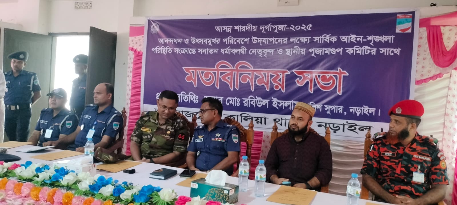 সভায় প্রধান অতিথি হিসেবে উপস্থিত ছিলেন নড়াইল জেলা পুলিশ সুপার মোঃ রবিউল ইসলাম। তিনি বলেন, “ধর্ম যার যার, উৎসব সবার। পূজা মণ্ডপে নিরাপত্তা নিশ্চিত করতে পুলিশ প্রশাসন সর্বোচ্চ প্রস্তুত রয়েছে।”