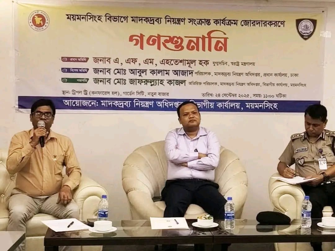 মাদকদ্রব্য নিয়ন্ত্রণ অধিদপ্তর, ময়মনসিংহ বিভাগীয় কার্যালয় উদ্যোগে নগরীর ট্রিপল ট্রি ক্যাফে অ্যান্ড রেস্টুরেন্টের চতুর্থ তলায় কনফারেন্স মিলানায়তনে এক গণশুনানির আয়োজন করা হয়।
