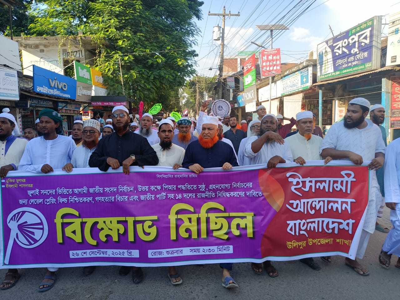 শুক্রবার (২৬ সেপ্টেম্বর) বিকেল ৪টায় উলিপুর মহারাণী স্বর্ণময়ী স্কুল অ্যান্ড কলেজ মাঠ থেকে জামায়াতে ইসলামী উপজেলা শাখার উদ্যোগে একটি বিক্ষোভ মিছিল বের হয়। মিছিলটি উলিপুর বাজারের প্রধান সড়কগুলো প্রদক্ষিণ করে। এতে উপজেলা আমির মাওলানা মো. মসিউর রহমান বলেন, “দেশে গণতন্ত্র নেই, মানুষের ভোটাধিকার নেই। জনগণের সরকার প্রতিষ্ঠা করতে হলে জুলাই সনদ অনুযায়ী জাতীয় নির্বাচন দিতে হবে। অন্যথায় জনগণ আর কোনো প্রহসনের নির্বাচন মেনে নেবে না।”
