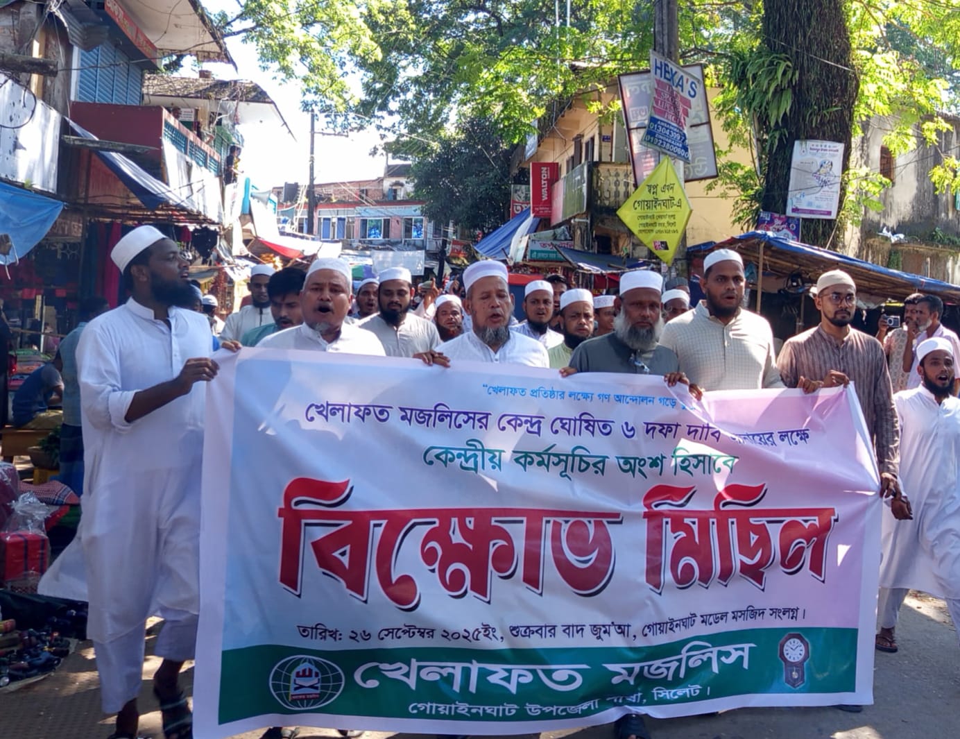 শুক্রবার (২৬ সেপ্টেম্বর) জুমআর নামাযের পর গোয়াইনঘাট উপজেলা মডেল মসজিদ সংলগ্ন থেকে তারকারি বাজার পয়েন্টে গিয়ে বিক্ষোভ মিছিল সমাবেশে মিলিত হয়। উপজেলা শাখার সভাপতি মাওলানা শরীফ উদ্দিনের সভাপতিত্বে অনুষ্ঠিত বিক্ষোভ মিছিল পরবর্তী সমাবেশে বক্তব্য রাখেন খেলাফত মজলিস গোয়াইনঘাট উপজেলা শাখার সহ-সভাপতি মাওলানা উবায়দুল্লাহ জহির, সাধারণ সম্পাদক মাওলানা আখলাকুল আম্বিয়া, সহ-সাধারণ সম্পাদক মাওলানা দেলওয়ার হোসাইন, ইসলামি যুব মজলিস গোয়াইনঘাট উপজেলা শাখার সভাপতি মাওলানা আখলাক হুসাইন, ইসলামী ছাত্র মজলিস গোয়াইনঘাট উপজেলা শাখার সাবেক সভাপতি আমিরুল ইসলাম আমীন।
