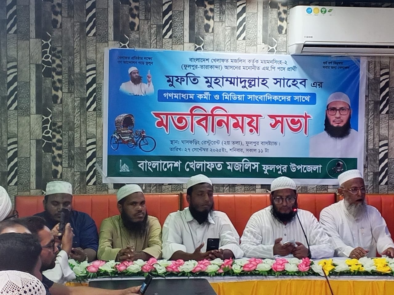 ময়মনসিংহের ফুলপুরে স্থানীয় সাংবাদিকদের সাথে মত বিনিময় করেছেন বাংলাদেশ খেলাফত মজলিসের ১৪৬ ময়মনসিংহ ২ (ফুলপুর-তারাকান্দা) সংসদীয় আসনের ( রিকশা প্রতিক) মনোনীত এমপি পদ প্রার্থী মুফতি মুহাম্মাদুল্লাহ।