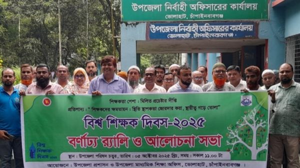 চাঁপাইনবাবগঞ্জের ভোলাহাটে উপজেলা মাধ্যমিক শিক্ষা দপ্তরের আয়োজনে বিশ্ব শিক্ষক দিবস ২০২৫ উদযাপন উপলক্ষ্যে বর্ণাঢ্য রেলী ও আলোচনা সভা রোববার (০৫ অক্টোবর ২০২৫) বেলা ১১টায় অনুষ্ঠিত হয়।