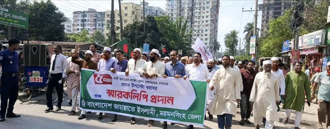 পি আর পদ্ধতিতে জাতীয় সংসদ নির্বাচন অনুষ্ঠানসহ পাঁচ দফা দাবি আদায়ের লক্ষ্যে ময়মনসিংহে জামায়াতে ইসলামী বাংলাদেশ ময়মনসিংহ জেলা প্রশাসকের মাধ্যমে সরকারের প্রধান উপদেষ্টা বরাবরে স্মারকলিপি প্রদান করেছেন।