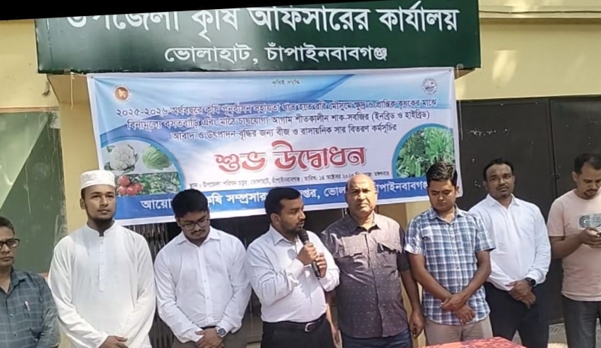 চাঁপাইনবাবগঞ্জের ভোলাহাটে ২০২৫-২৬ অর্থবছরে রবি মৌসুমে ক্ষুদ্র ও প্রান্তিক কৃষকদের মাঝে বিনামূল্যে বীজ ও সার বিতরণের প্রণোদনা কর্মসূচির উদ্বোধন করা হয়েছে।
