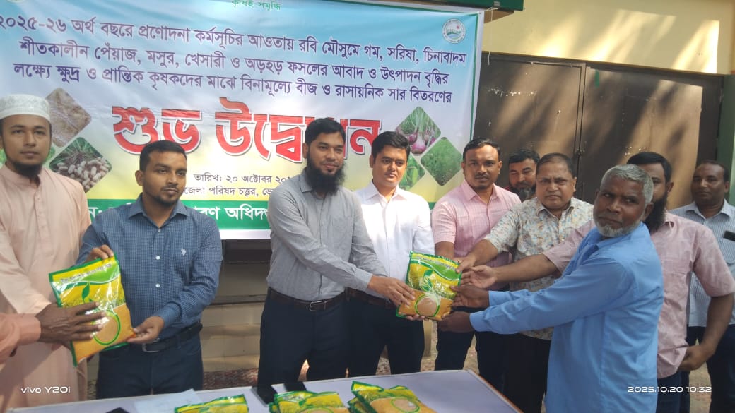 চাঁপাইনবাবগঞ্জের ভোলাহাটে উপজেলা কৃষি দপ্তরের আয়োজনে রবি মৌসুমে শীতকালীন ক্ষুদ্র ও প্রান্তিক কৃষকদের মাঝে বিনামূল্যে বীজ ও রাসায়নিক সার বিতরণ অনুষ্ঠান সোমবার সকাল ১০টায় (২০ অক্টোবর ২০২৫) উপজেলা কৃষি দপ্তর প্রাঙ্গণে অনুষ্ঠিত হয়।