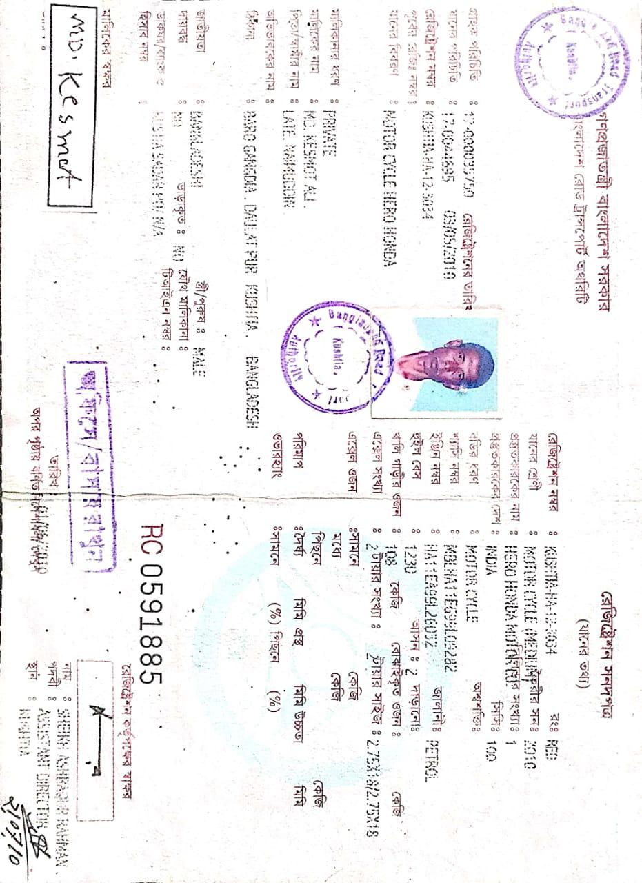 মোঃ কেসমত আলী (৬৪) আমার প্ বড় সন্তান মোঃ হাসমত আলী (৪২) ০৮ নং পিয়ারপুর ইউনিয়ন পরিষদ প্রশাসনিক কর্মকতা হিসাবে চাকুরী করেন। ইং- ১৯/১০/২০২৫ তাং সন্ধ্যা অনুমান ০৫.৩০ ঘটিকার সময় আমার ছেলে মোঃ হাসমত আলী দৌলতপুর থানাধীন বড়গাংদিয়া মাষ্টারপাড়া আমার নিজস্ব বসত বাড়ীর সামনে আমার নামীয় লাল রঙ্গের রেজিষ্ট্রেশন করা Hero Honda CD Deluxe 100 cc মোটর সাইকেল যাহার চেসিস নং-MBLHA11E699L09282, ইঞ্জিন নং-HA11EA99L26032, রেজিষ্ট্রেশন নম্বরঃ- কুষ্টিয়া- হ-১২-৩০৩৪, যাহার মূল্য ৯৬,০৮০০/-(ছিয়ানব্বই হাজার আটশত) টাকা রেখে উক্ত বাড়ীর সামনে রেখে বাড়ীর ভিতরে চলে আসে। পরবর্তীতে সন্ধ্যা অনুমান ০৬.০০ ঘটিকার সময় আমার ছেলে মোঃ হাসমত আলী, উক্ত মোটরসাইকেলটি নিতে গিয়া দেখে যে, মোটরসাইকেল টি যথা স্থানে নাই, কে বা কাহারা চুরি করিয়া নিয়া গিয়াছে। পরে আমি সহ মোঃ বজলুল হক (৪২) পিতা-মোঃ মুনছের আলী, মোঃ আব্দুল হালিম (৩৭) পিতা-মোঃ কেসমত আলী, উভয় সাং- বড়গাংদিয়া মাষ্টারপাড়া, থানা-দৌলতপুর, জেলা-কুষ্টিয়া সহ আশপাশের অনেক লোকজন আগাইয়া আসিলে আমার মোটরসাইকেল চুরি হইয়া গেছে ঘটনা জানায়। আমি সহ আমার ছেলে অনেক সম্ভাব্য জায়গায় খোঁজা খুঁজি করি কিন্তু মোটরসাইকেলের সন্ধান পায় নাই। আমার ও আমার ছেলের ধরনা অজ্ঞাতনামা চোর/ চোরেরা ইং ১৯/১০/২০২৫ তাং সন্ধ্যা অনুমান ০৫.৩০ ঘটিকার সময় পর হইতে সন্ধ্যা অনুমান ০৬.০০ ঘটিকার পূর্বে যে কোন সময়ের মধ্যে দৌলতপুর থানাধীন বড়গাংদিয়া মাষ্টারপাড়া গ্রামস্থ আমার বসত বাড়ীর সামনে থেকে আমার উপরোল্লেখিত মোটর সাইকেলটি চুরি করিয়া নিয়া যায়। চুরি যাওয়া মোটরসাইকেলের সন্ধান কাজে ব্যস্ত থাকায় এবং ঘটনার বিষয়ে আমার আত্মীয়-স্বজনদের সহিত আলাপ আলোচনা করিয়া থানায় আসিয়া অভিযোগ দায়ের করি।