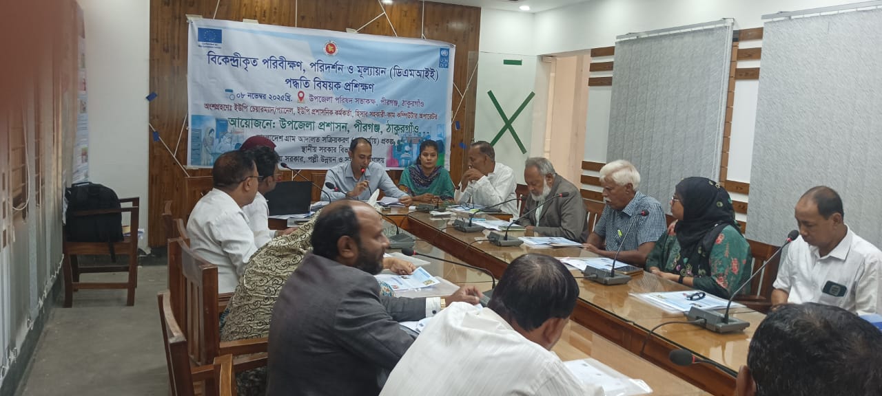 পীরগঞ্জ(ঠাকুরগাঁ)প্রতিনিধি ঃ গ্রাম আদালত বিষয়ে বিকেন্দ্রীকৃত পরিবীক্ষণ, পরিদর্শন ও মূল্যায়ন (ডিএমআইি) প্রশিক্ষণ দেওয়া হয়েছে ঠাকুরগাঁওয়ের পীরগঞ্জ। শনিবার উপজেলা পরিষদ সম্মেলন কক্ষে উপজেলা প্রশাসনের আয়োজনে এ প্রশিক্ষণ অনুষ্ঠিত হয়। উপজেলা নির্বাহী অফিসার রকিবুল হাসানের সভাপতিত্বে অনুষ্ঠিত সভায় সহকারি ভূমি কর্মকর্তা এন এম ইশফাকুল কবির সহ গ্রাম আদালতের উপজেলা কর্মকর্তাবৃন্দ ও দশটি ইউনিয়ন পরিষদের চেয়ারম্যান, ৭ জন প্রশাসনিক কর্মকর্তা এবং ৭ জন হিসাব সহকারী কাম কম্পিউটার অপারেটর সহ মোট ২৪ সভায় উপস্থিত ছিলেন।