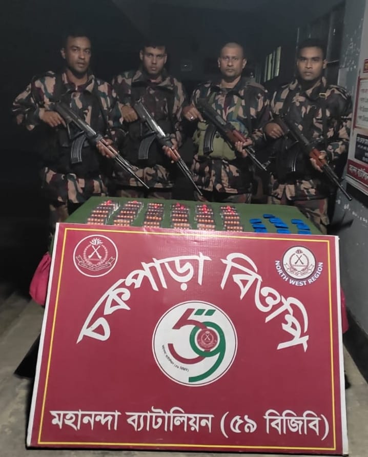 চাঁপাইনবাবগঞ্জ মহানন্দা ব্যাটেলিয়ান (৫৯ বিজিবি) সদস্যরা সীমান্তে সর্বদা সচেষ্ট অবস্থায় দায়িত্ব পালন করছে। এরই ধারাবাহিকতায় ১১ নভেম্বর ২০২৫ তারিখ সন্ধ্যা আনুমানিক ০৬:৩০ ঘটিকায় মহানন্দা ব্যাটালিয়ন (৫৯ বিজিবি) এর চকপাড়া বিওপি’র ০১টি বিশেষ টহল দল সীমান্ত পিলার ১৮২/৪-এস হতে আনুমানিক ২০ গজ বাংলাদেশের অভ্যন্তরে চাঁপাইনবাবগঞ্জ জেলার শিবগঞ্জ থানাধীন শাহাবাজপুর ইউনিয়নের উপচকপাড়া গ্রামের ১৯ বিঘা নামক এলাকায় অভিযান পরিচালনা করে। উক্ত অভিযানে টহল দল মালিকবিহীন বিপুল পরিমাণ নেশাজাতীয় ট্যাবলেট (ইয়াবা-১৯৪০ পিস এবং Tapentadol ট্যাবলেট-৩৬০০ পিস) আটক করতে সক্ষম হয়। অভিযান পরিচালনার সময় চোরাকারবারীরা বিজিবি’র উপস্থিতি টের পেয়ে ঘটনাস্থল হতে পালিয়ে যায়। বর্তমানে আটককৃত নেশাজাতীয় ট্যাবলেটগুলো জিডি করতঃ শিবগঞ্জ থানায় হস্তান্তরের কার্যক্রম চলমান রয়েছে।