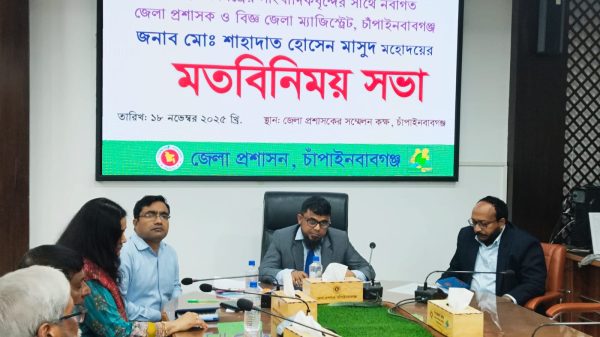 চাঁপাইনবাবগঞ্জে সাংবাদিকদের সাথে নবাগত জেলা প্রশাসকের মতবিনিময় সভা অনুষ্ঠিত হয়। চাঁপাইনবাবগঞ্জের নবাগত জেলা প্রসাশক ও বিজ্ঞ জেলা ম্যাজিস্ট্রেট বৃহস্পতিবার (১৮ নভেম্বর) বিকাল ৪ ঘটিকায় জেলা প্রশাসক কার্যালয়ের সম্মেলনকক্ষে এ মতবিনিময় সভা অনুষ্ঠিত হয়। উক্ত মতবিনিময় সভার শুরুতেই বক্তব্য রাখেন নবাগত জেলা প্রশাসক মো. শাহাদাত হোসেন মাসুদ। এছাড়াও মতবিনিময় সভায় বক্তব্য রাখেন চাঁপাইনবাবগঞ্জ প্রেসক্লাবের সভাপতি গোলাম মোস্তফা মন্টু, চাঁপাইনবাবগঞ্জ জেলা প্রেসক্লাবের সভাপতি হোসেন শাহনেওয়াজ, সাধারণ সম্পাদক মনোয়ার হোসেন জুয়েল, দৈনিক চাঁপাই দর্পন এর প্রকাশক ও সম্পাদক মোঃ আশরাফুল ইসলাম রঞ্জু, দৈনিক গৌড় বাংলার পত্রিকার প্রকাশক ও সম্পাদক হাসিব হোসেন, সিনিয়র সাংবাদিক শহীদুল হুদা অলক, ডাবলু কুমার ঘোষ, মডেল প্রেসক্লাবের সভাপতি ফেরদৌস সিহানুক শান্ত, সাধারণ সম্পাদক বদিউজ্জামান রাজাবাবু, সিটি প্রেসক্লাবের সভাপতি কামাল শুকরানা, সাধারণ সম্পাদক মেহেদী হাসান, চাঁপাইনবাবগঞ্জ মহানন্দা প্রেসক্লাবে সাধারণ সম্পাদক এনামুল হক নাসিম, সাংবাদিক জাকির হোসেন পিংকু, জহুরুল ইসলাম, ফারুক আহমেদ, তারেক রহমান, আনোয়ার হোসেন, আজিজুল হক শিশির,অন্যান্যরা। মতবিনিময় সভায় সংবাদকর্মীরা জেলার মাদক, সীমান্তে বিভিন্ন