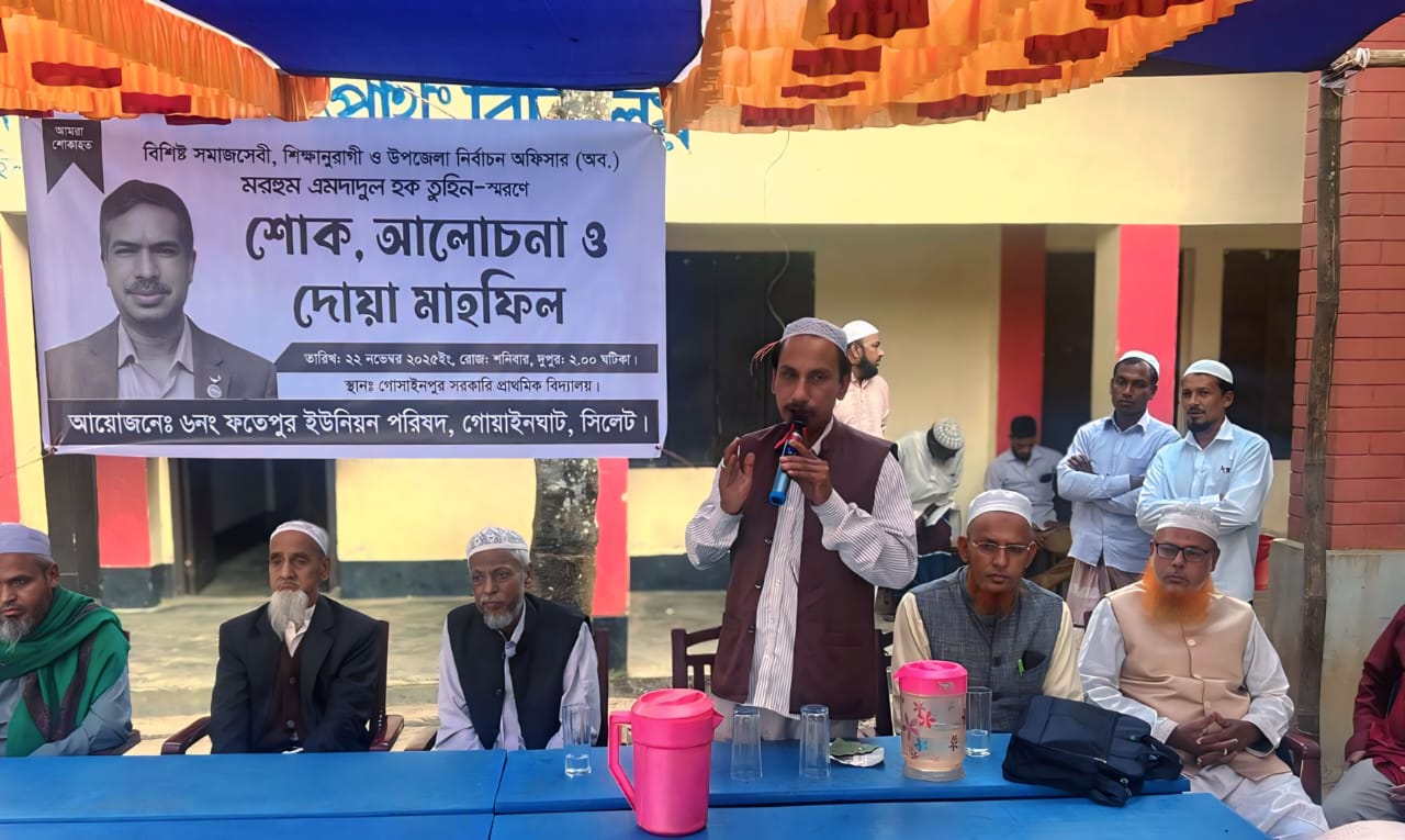 সিলেটের গোয়াইনঘাট উপজেলার ৬নং ফতেপুর ইউনিয়ন পরিষদের চেয়ারম্যান মোঃ মিনহাজ উদ্দিন বলেন, আমাদের এলাকার কৃতি সন্তান সাবেক উপজেলা নির্বাচন অফিসার মারহুম এমদাদুল হক তুহিন আমাদের জন্য এক অনুপম আদর্শ। তাঁর মাধ্যমে আমাদের এলাকার অনেক উন্নয়ন মূলক কাজ সম্পাদিত হয়েছে। তিনি আমাদের গুণিজন। আর গুণিজনের সম্মান করা সামাজিকতার অপরিহার্য দাবি। ড. মুহাম্মাদ শহীদুল্লাহ বলেছিলেন, "যে সমাজে গুণিজনের সম্মান করা হয় না সে সমাজে গুণিজন জন্মায় না।" এজন্য আমাদের সমাজে যাদের মাধ্যমে সামান্যতম হলেও কল্যাণ ও উন্নয়ন সাধিত হয় তাদের সম্মান প্রদর্শন করা আমাদের নৈতিক দায়িত্ব। ৬নং ফতেপুর ইউনিয়ন পরিষদ আয়োজিত বিশিষ্ট সমাজসেবক, শিক্ষানুরাগী ও সাবেক উপজেলা নির্বাচন অফিসার মারহুম এমদাদুল হক তুহিন এর স্মরণে আলোচনা সভা ও দোয়া মাহফিলে প্রধান অতিথির বক্তব্যে তিনি এসব কথা বলেন।