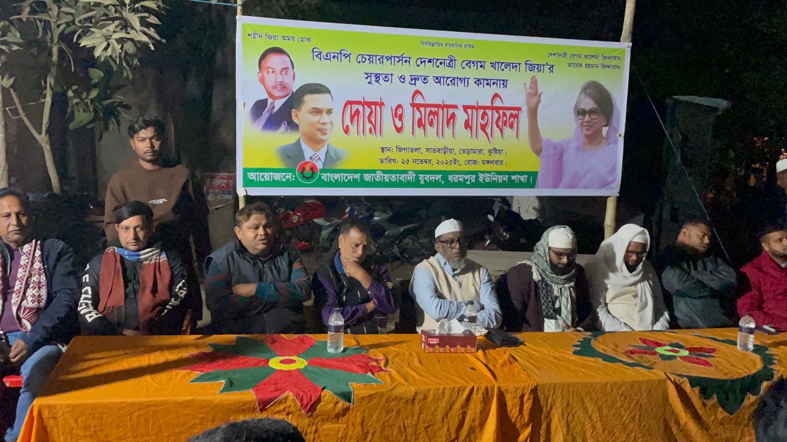 কুষ্টিয়ার ভেড়ামারা উপজেলার ধরমপুর ইউনিয় ৯ নং ওয়ার্ডে ২৫ নভেম্বর, ২০২৫ ইং তারিখ রোজ: মঙ্গলবার বাংলাদেশ জাতীয়তাবাদী যুবদল, ধরমপুর ইউনিয়ন শাখার উদ্যোগে বিএনপির চেয়ারপার্সন দেশনেত্রী বেগম খালেদা জিয়া'র সুস্থতা ও দ্রুত আরোগ্য কামনায় দোয়া ও মিলাদ মাহফিল। উক্ত অনুষ্ঠানে উপস্থিত ছিলেন ভেড়ামারা উপজেলা বিএনপি'র আহ্বায়ক ও ভেড়ামারা উপজেলা পরিষদের সাবেক চেয়ারম্যান ও ভেড়ামারা পৌরসভার সাবেক মেয়র জনাব এ্যাড তৌহিদুল ইসলাম আলম। আরো উপস্থিত ছিলেন ধরমপুর ইউনিয়ন যুবদলের সাবেক সভাপতি মোঃ সোহেল রানা, আশরাফুল ইসলাম অপু, সহ সভাপতি,