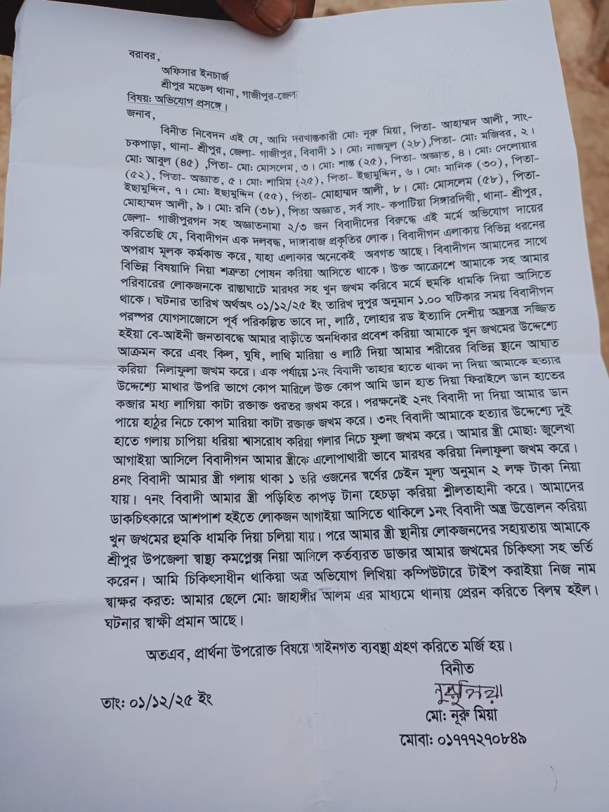 আহত নুরুল মিয়া বলেন, আমার বাড়ির পশ্চিম পার্শ্বে আমি ধান শুকাতে ছিলাম। ওই সময় হঠাৎ করে সন্ত্রাসীরা পিছন দিক দিয়ে আমার ওপর হামলা করে এবং দা-লাঠি দিয়ে হামলা করতে থাকে। আমার চিৎকার আমার পরিবারের লোকজন এবং এলাকাবাসী সন্ত্রাসীদের হাত থেকে উদ্ধার করে এবং শ্রীপুর উপজেলা স্বাস্থ্য কমপ্লেক্সে চিকিৎসার জন্য ভর্তি করে। তারপর চিহ্নিত এবং পরিচিত ওই সন্ত্রাসীদের বিরুদ্ধে থানায় আমি একটি অভিযোগ ধায়ের করি। দুঃখের বিষয় এখন পর্যন্ত প্রশাসনের কোন প্রকার কার্যকরী কার্যক্রম দেখতে পাচ্ছি না।