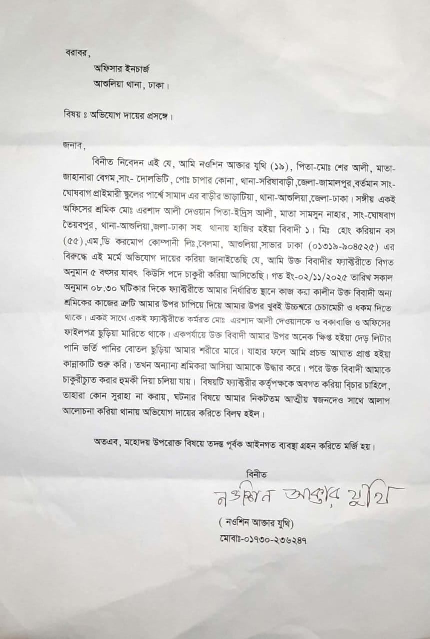 সিনিয়র রিপোর্টার,মোঃ আসিফুজ্জামান আসিফ: ঢাকার শিল্পাঞ্চল আশুলিয়ার বেলমা এলাকায় করমোপ কোম্পানি লিমিটেডে কর্মরত এক নারী শ্রমিককে মারধর, অশ্রাব্য গালিগালাজ ও চাকরিচ্যুতির হুমকি দেওয়ার অভিযোগ উঠেছে প্রতিষ্ঠানের কোরিয়ান ব্যবস্থাপনা পরিচালক (এমডি) মি. হোং (৫৫)-এর বিরুদ্ধে। ভুক্তভোগী নওশিন আক্তার যুথি (১৯) ঘটনাটি ঘটার কয়েক দিন পর থানায় লিখিত অভিযোগ দায়ের করেছেন।