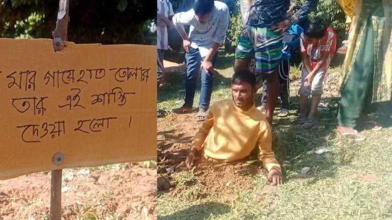 মাকে মারধর ও নির্যাতন ছেলের, মাদকাসক্ত ছেলেকে কোমরসমান মাটিতে পুঁতে দিল এলাকাবাসী।
