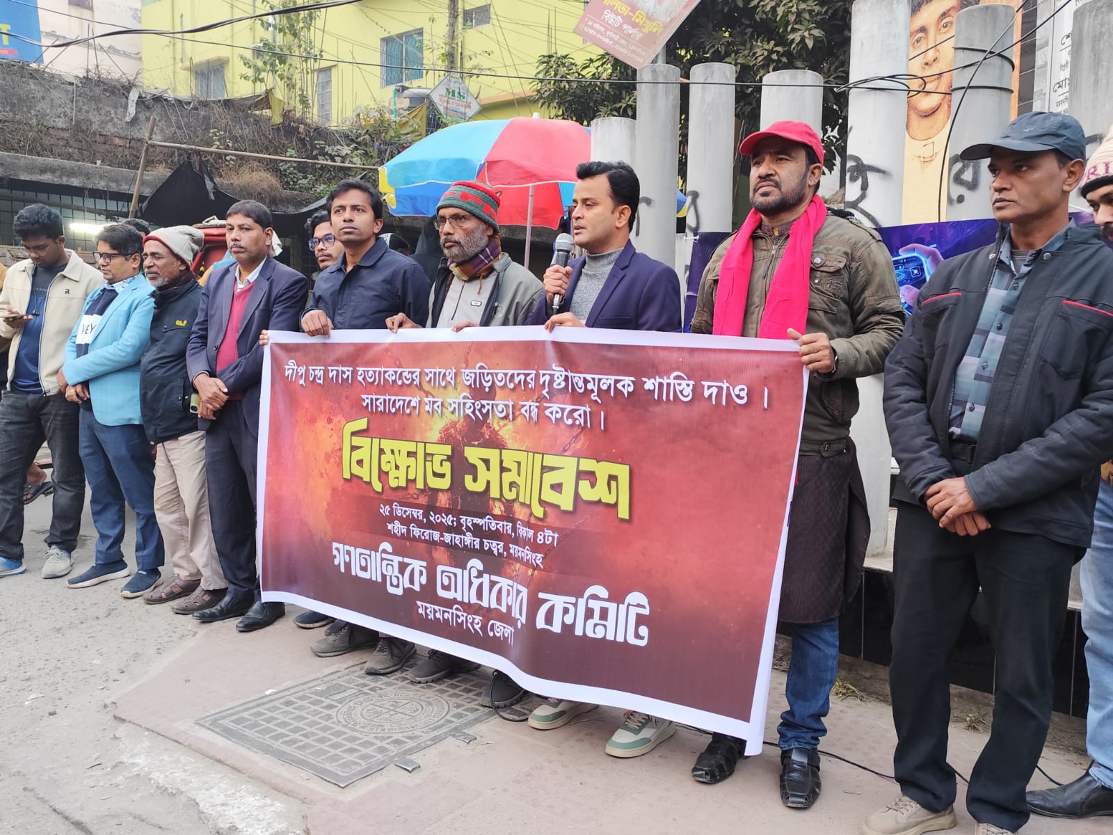 ময়মনসিংহের শহীদ ফিরোজ-জাহাঙ্গীর চত্বরে দীপু দাস হত্যাকান্ডে জড়িতদের দৃষ্টান্তমূলক শাস্তি ও সারাদেশে মব সহিংসতা বন্ধের দাবিতে গণতান্ত্রিক অধিকার কমিটির আজ ২৫ডিসেম্বর বৃহস্পতিবার বিকালে বিক্ষোভ সমাবেশ অনুষ্ঠিত হয়েছে।