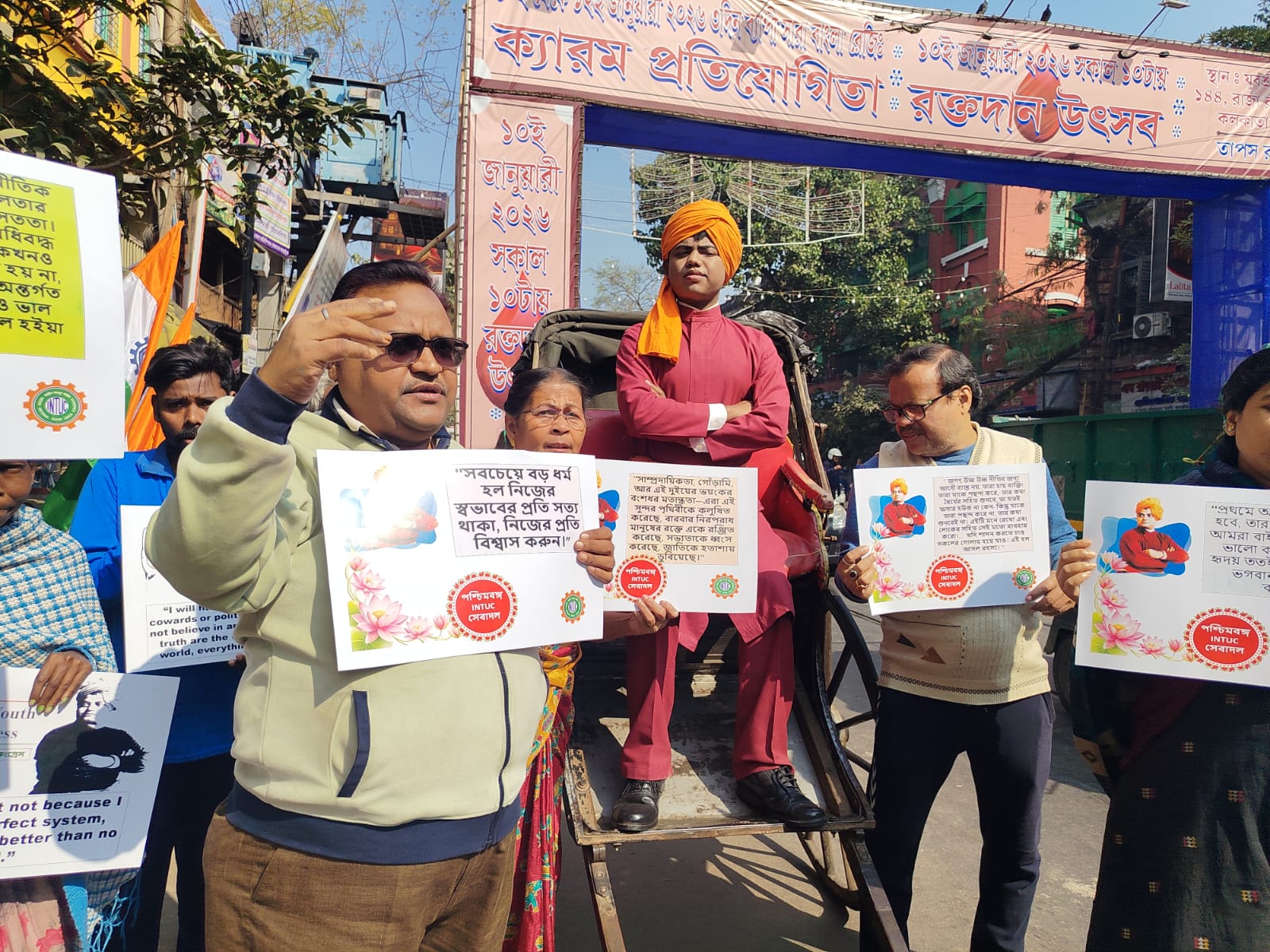 এরপর প্রতিকী স্বামীজিকে হাতে টানা রিক্সায় চাপিয়ে, ৪৮ নম্বর ওয়ার্ডের প্রতিটি অলিতে গলিতে পরিদর্শন করেন এবং স্বয়ং একটি বার্তা দেন, সাম্প্রদায়িকতার যে বিষবাষ্প সরকারি মদতে আজ ভারতবর্ষের স্বাধীনতাকে বিপন্ন করেছে তার বিরুদ্ধেই স্বয়ং স্বামীজি কে নিয়ে আমাদের এই শোভাযাত্রা। জীবে প্রেম করে যেই জন- সেই জন সেবিছে ঈশ্বর, কষ্ট না করলে কোনদিন যেমন কেষ্ট মেলে না, মন থেকে হিংসা দূর না হলে কখনো ঈশ্বরকে পাওয়া যায় না। স্বামীজি কখনো ধর্মকে বিভেদ করেননি, সব সর্ব ধর্মের মানুষকে নিয়েই চলতে শিখে ছিলেন। আমরা তাই প্রতিকী স্বামীজিকে নিয়ে মানুষের মন থেকে হিংসা দূর করার ও শান্তির বার্তা দিলাম।