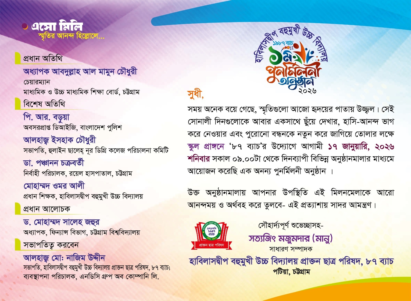 উক্ত পুনর্মিলনী অনুষ্ঠানে প্রধান অতিথি হিসেবে উপস্থিত থাকবেন মাধ্যমিক ও উচ্চ মাধ্যমিক শিক্ষা বোর্ড চট্টগ্রাম এর সম্মানিত চেয়ারম্যান প্রফেসর আবদুল্লাহ আল মামুন চৌধুরী,প্রধান আলোচক হিসেবে উপস্থিত থাকবেন চট্টগ্রাম বিশ্ববিদ্যালয়ের ফিন্যান্স বিভাগের অধ্যাপক মুহাম্মদ সালেহ জহুর, বিশেষ অতিথি হিসেবে উপস্থিত থাকবেন সাবেক পুলিশের ডিআইজি পি আর বড়ুয়া,হুলাইন ছালেহ্ নূর ডিগ্রী কলেজ পরিচালনা কমিটি সভাপতি ও চট্টগ্রাম পল্লী বিদ্যুৎ সমিতি-১ এর সাবেক চেয়ারম্যান আলহাজ্ব মোঃ ইসহাক চৌধুরী,চট্টগ্রাম রয়েল হাসপাতালের পরিচালক ডাক্তার পঞ্চানন চক্রবর্তী,হাবিলাসদ্বীপ উচ্চ বিদ্যালয়ের প্রধান শিক্ষক মুহাম্মদ ওমর আলী। অনুষ্ঠানে সভাপতিত্ব করবেন এনডিসি গ্রুপের ব্যবস্হপনা পরিচালক আলহাজ্ব মোঃ নাজিম উদ্দিন।