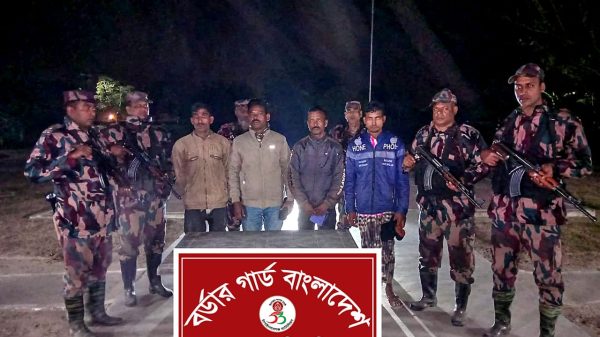 বিজিবি সূত্র জানায়, গোপন সংবাদের ভিত্তিতে গত বুধবার (১৪ জানুয়ারি ) সন্ধ্যা ৭টার দিকে বকচর বিওপির দায়িত্বপূর্ণ সীমান্ত এলাকায় একটি টহলদল অভিযান পরিচালনা করে। অভিযানে শূন্যরেখা থেকে প্রায় ২০০ গজ বাংলাদেশের অভ্যন্তরে চাঁপাইনবাবগঞ্জ সদর উপজেলার চরআলাতলী ইউনিয়নের বকচর গ্রাম থেকে মানব পাচারকারী মোঃ শাহিনসহ চারজনকে আটক করা হয়। প্রাথমিক জিজ্ঞাসাবাদে আটক ব্যক্তিরা জানায়, মোঃ শাহিনের সহায়তায় তারা অবৈধভাবে ভারতের চেন্নাই প্রদেশে রাজমিস্ত্রির কাজের উদ্দেশ্যে যাওয়ার পরিকল্পনা করছিল। আটককৃতরা হলেন— ১.চাঁপাইনবাবগঞ্জ সদর উপজেলা আলাতলী বকচর গ্রামের এবাদুল ইসলামের ছেলে মোঃ শাহিন, ২. রংপুর জেলার মিঠাপুকুর থানাধীন সরাল দুর্গাপুর গ্রামের মৃত মনছুর আলীর ছেলে মোঃ তারাজুল ইসলাম (৩১), ৩. রাজশাহী জেলা বোয়ালিয়া থানাধীন ঘোগামারা আসাম কলোনী গ্রামে মৃত বেলায়েত হোসেনের ছেলে মোঃ শফিকুল ইসলাম মুন্না (৩৭), ৪.চাঁপাইনবাবগঞ্জ জেলা শিবগঞ্জ থানাধীন চাঁদপুর লাহোলামারী গ্রামে মৃত টুপু আলীর ছেলে মোঃ মিজানুর রহমান। আটককৃতদের বিরুদ্ধে আইনানুগ ব্যবস্থা গ্রহণের জন্য চাঁপাইনবাবগঞ্জ সদর মডেল থানায় হস্তান্তরের প্রক্রিয়া চলমান রয়েছে।