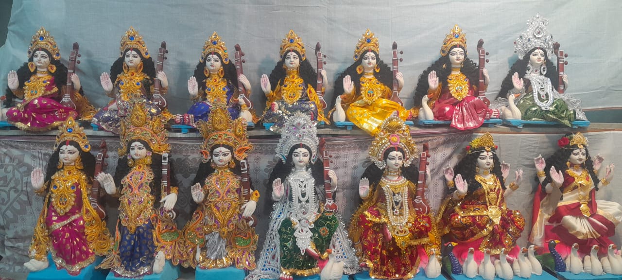 আর কুমারটুলি পাড়া মালি প্রতিমার বিভিন্ন রূপ আমরা দেখতে পাই, সেই রকমই এক মহিলা মৃৎশিল্পী রমা পালের স্টুডিওতে দেখা গেলো প্রায় একশটিরও বেশি সরস্বতী প্রতিমার রূপ বিভিন্ন রকমের শুধু তাই নয়, তাহার প্রতিমার সাজ সজ্জা অন্যান্য প্রতিমা থেকে অনেকটাই আলাদা, ছোট ছোট প্রতিমা হলেও তোমার রূপ পূজা উদ্যোক্তাদের মন কেড়ে নিয়েছে , বেশিরভাগই প্রতিমা অর্ডার হয়ে গেছে, এই স্টুডিওতেই একটি তার ছোট্ট মেয়ে খুশি বাবার হাত ধরে এগিয়ে চলেছে প্রতিমা গড়ার, এখন পড়ার ফাঁকে কাজে যোগ দিয়েছে মায়ের সাথে, বাবাকে হারিয়ে মাকে এইভাবে পেয়ে সেও খুশি, মা ও মেয়ে চেষ্টা করছেন বাবার প্রতিমা গড়ার ঐতিহ্য কে ধরে রাখতে, মৃৎ শিল্পী রুমা পাল জানালেন সকলের আশীর্বাদে আমার প্রতিমা নিতে দূর দূরান্ত থেকে আসে, অনেকে ইউটিউব দেখে আমাকে ফোন করে, আমার প্রতিমা অন্য দেশ থেকে যদি অর্ডার হয় পাঠাতে পারব কিনা, উনি তাদের জানিয়েছেন আমি এখনো পর্যন্ত পাঠাইনি আগামী দিনের চেষ্টা করবো আমার ঠাকুর বিদেশ পাড়ি দিক। তিনি আরো জানালেন আমি এই সরস্বতী প্রতিমার যে সকল ডাকের গহনা ও শাড়ি ব্যবহার করি, সচরাচর কেউ ব্যবহার করে না, এমনকি নিজে প্রতিমা গুলিকে ডাকের গয়নায় সাজিয়ে তুলেন অপূর্ব রূপে, তুমি আরো জানান আমি এই কষ্টলি ডাকের সাজ পড়ায় বলেই হয়তো প্রতিমার দাম আমার একটু বেশি, কিন্তু তাতে আমার অসুবিধা হয় না। কারণ পূজা উদ্যোক্তারা আমার প্রতিমা প্রতিবছর নিয়ে যান ভালো লাগে বলেই। আপনারা সেটা দাঁড়িয়ে থেকেই দেখতে পাচ্ছেন একের পর এক আমার প্রতিমা বায়না দিয়ে চলে যাচ্ছে। আর সকলে প্রতিমা অর্ডার দিতে এসে আগেই একটি সেলফি তুলে নেন, আর সকলের মুখে একটা কথা সত্যিই ছোট হলেও প্রতিমার মুখগুলি কল্পনীয়। এত সুন্দর সুন্দর মুখের গঠন ও প্রতিমার গঠন।