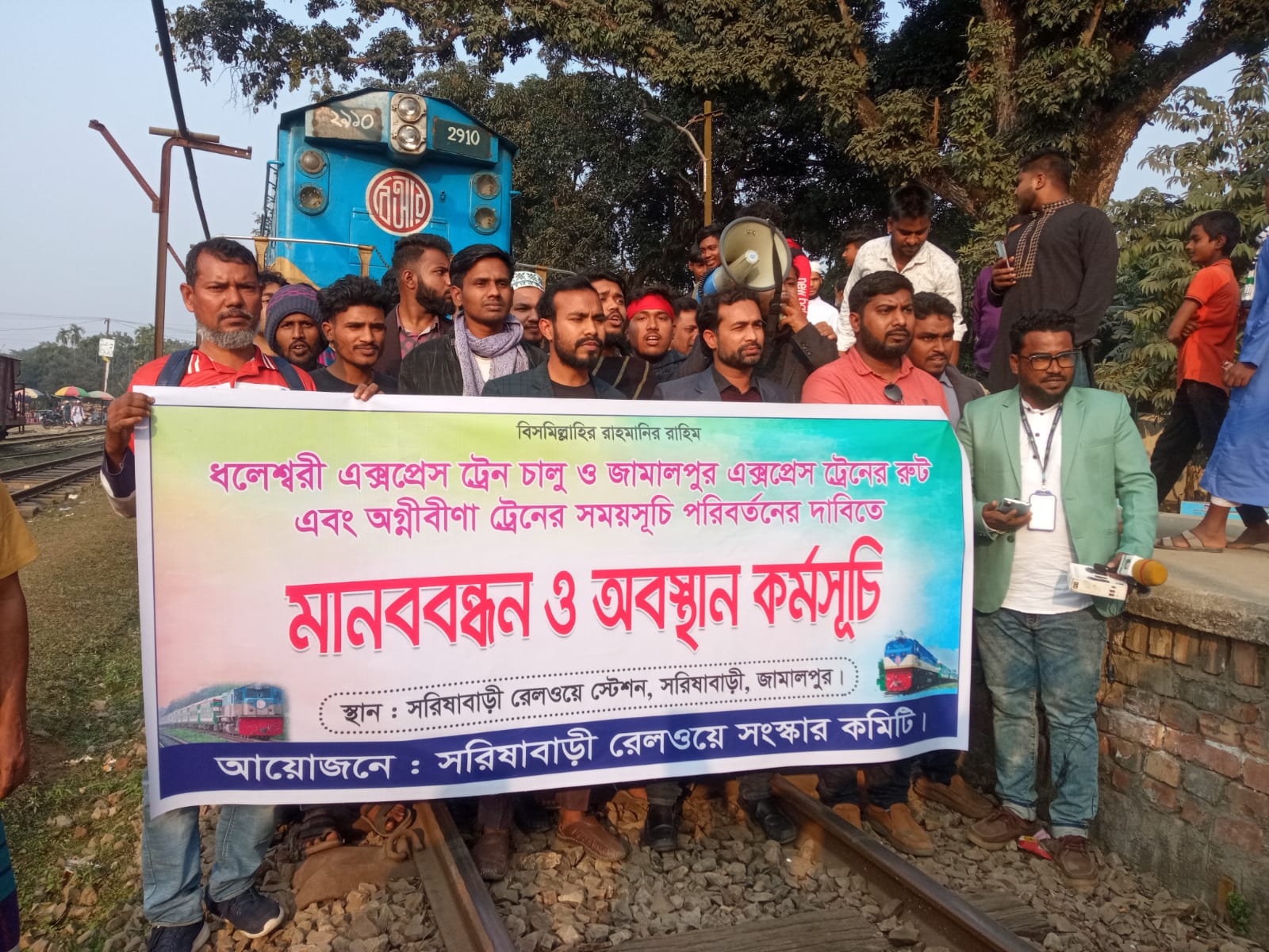 বন্ধ ট্রেন পুনরায় চালু, আন্তঃনগর এক্সপ্রেস ট্রেনের সময়সূচি পুনর্বিন্যাস ও রুট সংশোধনের দাবিতে জামালপুরের সরিষাবাড়ীতে আন্তঃনগর ট্রেন আটকে মানববন্ধন ও অবস্থান কর্মসূচি পালন করেছে রেলওয়ে সংস্কার কমিটি।