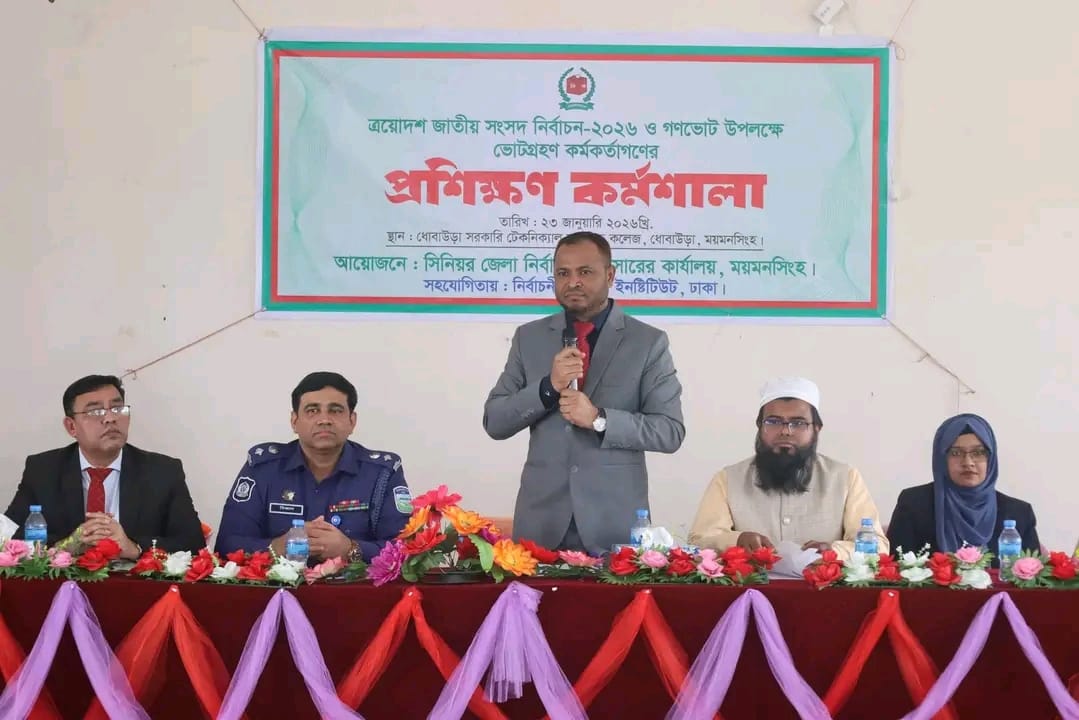মকবুল হোসেন, ময়মনসিংহ জেলা প্রতিনিধি : আসন্ন ত্রয়োদশ জাতীয় সংসদ নির্বাচন-২০২৬ ও গণভোট উপলক্ষ্যে ময়মনসিংহ জেলার ধোবাউড়া উপজেলায় আজ ২৩জানুয়ারি শুক্রবার নির্বাচনী প্রশিক্ষণ ইনষ্টিটিউট, ঢাকার সহযোগিতায়, সিনিয়র জেলা নির্বাচন অফিসারের কার্যালয় ময়মনসিংহের আয়োজনে ধোবাউড়া সরকারি টেকনিক্যাল স্কুল এন্ড কলেজের হল রুমে ভোটগ্রহণ কর্মকর্তাগণের প্রশিক্ষণ কর্মশালা অনুষ্ঠিত হয়। উক্ত অনুষ্ঠানে প্রধান অতিথি হিসেবে উপস্থিত ছিলেন ময়মনসিংহ জেলা প্রশাসক ও রিটার্নিং অফিসার মোঃ সাইফুর রহমান, বিশেষ অতিথি হিসেবে উপস্থিত ছিলেন ময়মনসিংহ জেলার পুলিশ সুপার মোঃ মিজানুর রহমান।