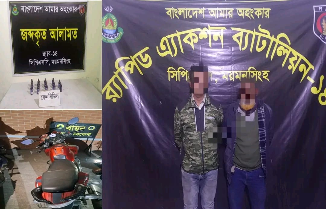 মকবুল হোসেন,,ময়মনসিংহ জেলা প্রতিনিধি :ময়মনসিংহ সিপিএসসি, র্যাব-১৪, এর আভিযানিক দল গোপন সংবাদের ভিত্তিতে ০৪ ফেব্রুয়ারী ২০২৬খ্রিঃ বিকাল অনুমান ১৬৪৫ ঘটিকায় ময়মনসিংহ জেলার মুক্তাগাছা থানাধীন ভাবকির মোড় সংলগ্ন মেসার্স জান্নাত ফার্নিচার এর সামনে ময়মনসিংহ-জামালপুর রোডে পাকা রাস্তার উপর চেকপোস্ট স্থাপন করে। উক্ত চেকপোস্টে একটি মোটরসাইকেল চেকপোস্ট অতিক্রম করাকালীন সিগন্যাল দিয়ে থামিয়ে মাদককারবারি ১। মোঃ ভুট্টো মিয়া (৫০), থানা-পলাশবাড়ী, ২। মোঃ আরিফুল আহাদ (৪২), থানা-গাইবান্ধা সদর, উভয় জেলা- গাইবান্ধাদের আটক করে। উপস্থিত সাক্ষীদের উপস্থিতিতে তাদের জিজ্ঞাসাবাদে অবৈধ মাদকদ্রব্য ফেন্সিডিল থাকার কথা স্বীকার করে। তাদের দেওয়া তথ্যে এবং দেখানো মতে মোটরসাইকেলে বক্সের ভিতর বিশেষ কায়দায় রক্ষিত অবৈধ মাদকদ্রব্য ১৪ (চৌদ্দ) বোতল ফেন্সিডিল উদ্ধার করতঃ ০৩ টি মোবাইল ফোন এবং মোটরসাইকেল জব্দ করতে সক্ষম হয়। উদ্ধারকৃত অবৈধ মাদক দ্রব্য ফেন্সিডিল এর আনুমানিক বাজার মূল্য ২৮,০০০/-(আটাশ হাজার) টাকা।