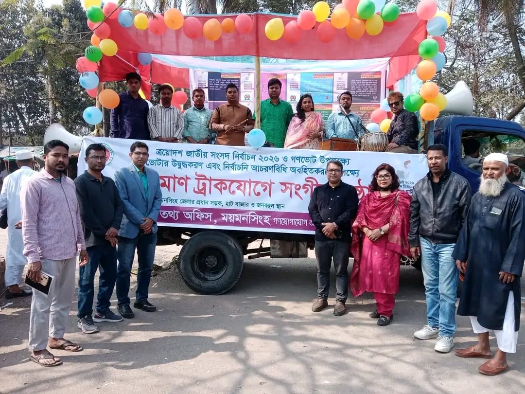 মকবুল হোসেন ,ময়মনসিংহ জেলা প্রতিনিধি :ত্রয়োদশ জাতীয় সংসদ নির্বাচন২০২৬ ও গনভোট উপলক্ষে ভোটার উদ্বুদ্ধকরণ এবং নির্বাচনী আচরণ বিধি অবহিত করণের লক্ষ্যে ময়মনসিংহে ভ্রাম্যমাণ ট্রাকযোগে নির্বাচনি প্রচারণা অনুষ্ঠিত হয়।