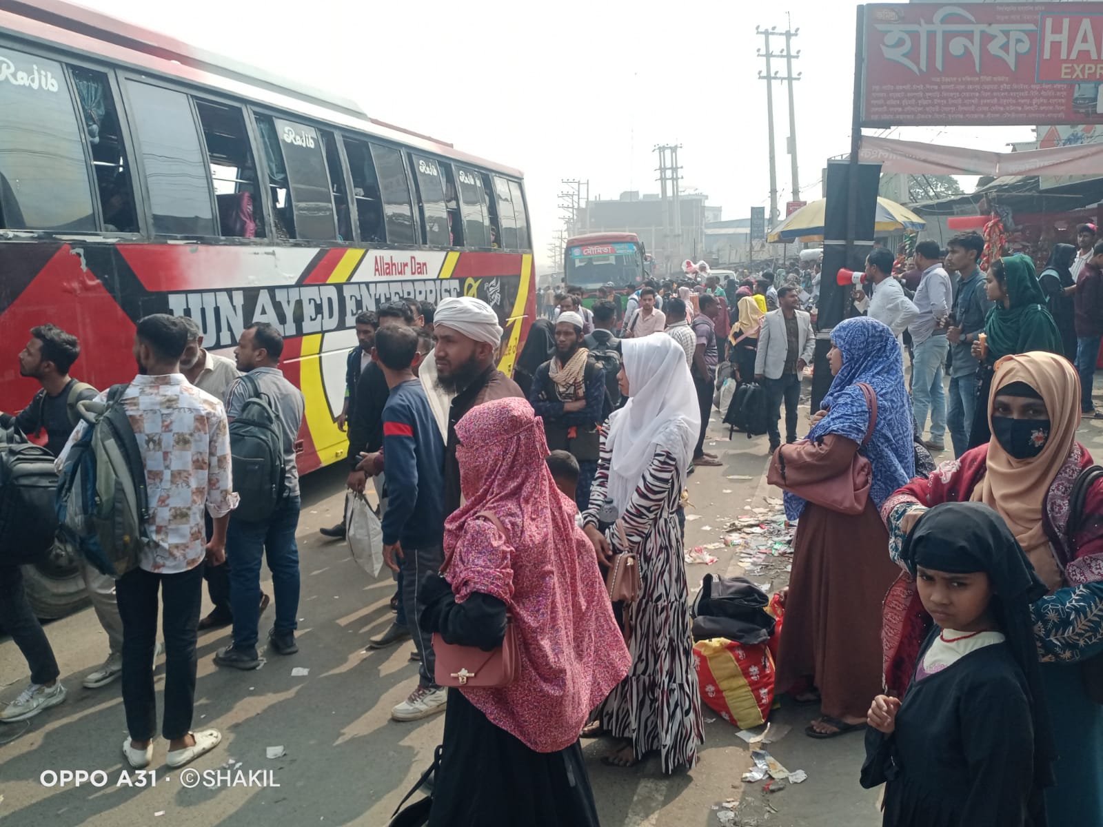 হাসান, যাত্রী জানান, ঢাকা থেকে চন্দ্রা যেতে যেখানে সাধারণত বাসভাড়া ১৫০ থেকে ২৫০ টাকা, সেখানে ৪৫০ থেকে ৫০০ টাকা পর্যন্ত আদায় করা হচ্ছে। বাস না পেয়ে অনেক যাত্রী বাধ্য হয়ে ট্রাকেও উঠছেন। ট্রাকে জনপ্রতি নেওয়া হচ্ছে ২০০ থেকে ৩০০ টাকা।