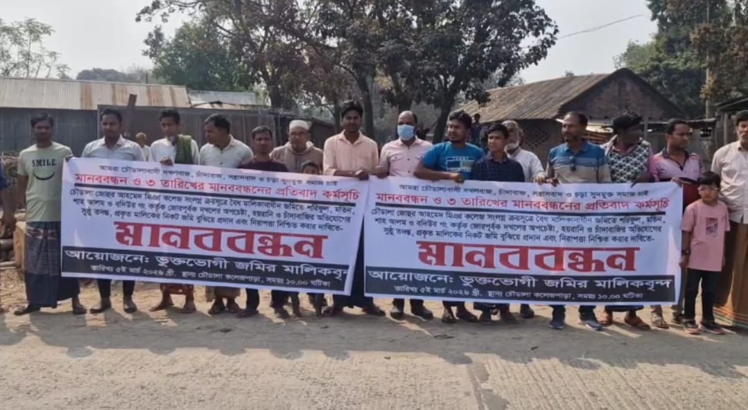 চাঁপাইনবাবগঞ্জে জোরপূর্বক জমি দখল ও চাঁদাবাজির বিরুদ্ধে মানববন্ধন