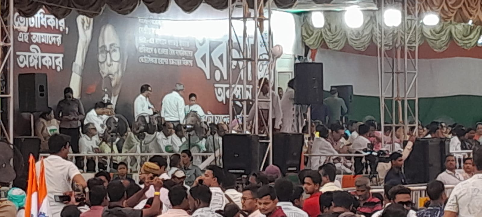মঞ্চ থেকে বিভিন্ন নেতা ও মন্ত্রীরা বলেন, দিদির পাশে আছি, দেখব কি করে? ভোটার লিস্ট থেকে নাম্বার দিতে পারে, আর বাংলার মানুষ আপনাদেরকে আবার জবাব দেবে, আমাদের দিদি আবার জিতবে, বাংলার মানুষ সেটাই দেখতে চায়, আর সকলের সামনে তুলে ধরার জন্য আর বাবা মা দীর্ঘদিন ধরে এদেশে বাস করছেন, যে সকল প্রার্থীর নাম ভোটার লিস্টটি কে কেটে বাদ দেয়া হয়েছে সবাই উপস্থিত আছেন।