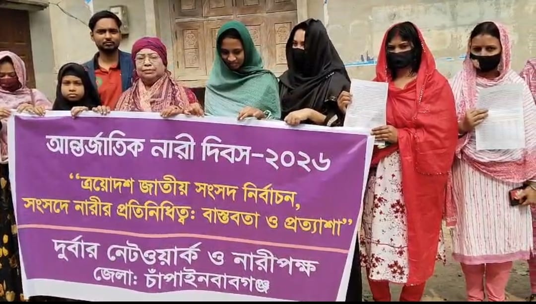 শনিবার (৭ মার্চ) সকাল ১০টায় শহরের নামোশংকরবাটী চৌমুহনী রোড সংলগ্ন এলাকায় দুর্বার নেটওয়ার্ক ও নারীপক্ষ চাঁপাইনবাবগঞ্জ জেলা শাখার উদ্যোগে এই মানববন্ধন কর্মসূচি পালন করা হয়।মানববন্ধনে বক্তারা বলেন, নারীসহ রাষ্ট্রের সকল নাগরিকের মর্যাদা ও অধিকার প্রতিষ্ঠার লক্ষ্যে দুর্নীতিমুক্ত, বৈষম্যহীন ও মানবিক বাংলাদেশ গড়ে তুলতে হবে। এজন্য নারীর রাজনৈতিক প্রতিনিধিত্ব বৃদ্ধি এবং নারীর প্রতি সকল ধরনের বৈষম্য বন্ধে কার্যকর পদক্ষেপ গ্রহণ জরুরি।অনুষ্ঠানে উপস্থিত ছিলেন রাজশাহী বিভাগের চার জেলার দায়িত্বপ্রাপ্ত ও সমতা নারী উন্নয়ন সংস্থার সভানেত্রী মোছা. আকসানা খাতুন। এছাড়াও উপস্থিত ছিলেন সমতা নারী উন্নয়ন সংস্থার সম্পাদিকা আজিজা খাতুন, শিবগঞ্জ উপজেলার শান্তি নিবিড় পাঠাগারের প্রতিষ্ঠাতা মো. নাহিদউজ্জামান এবং সমতা নারী উন্নয়ন সংস্থার সদস্য ও মুন্নি মোল্লা হোমমেটের স্বত্বাধিকারী মুর্শেদা খাতুন মুন্নি প্রমুখ।