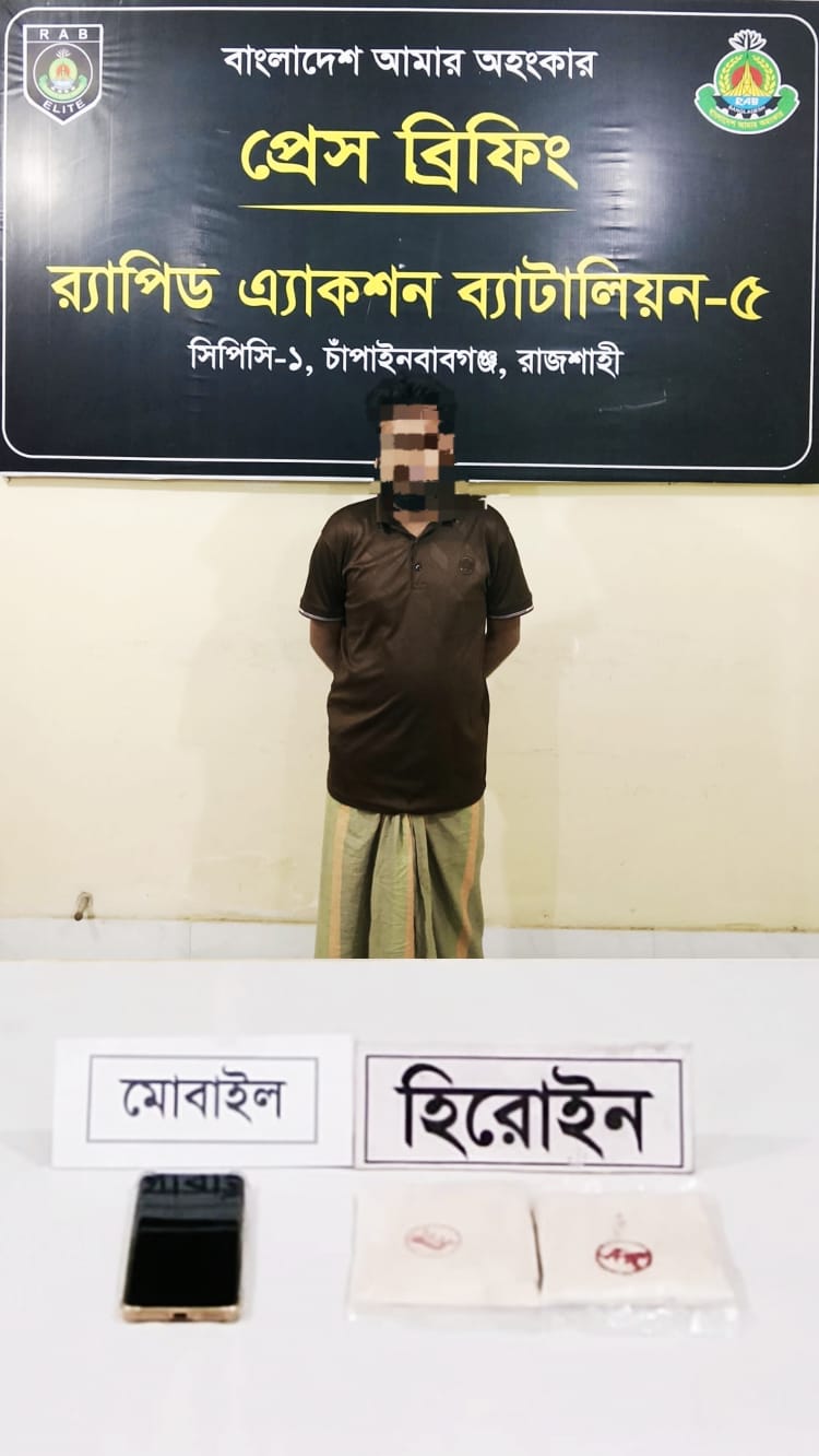 চাঁপাইনবাবগঞ্জে র্যাব-৫ অভিযানে ২০০ গ্রাম হেরোইনসহ মাদক কারবারি গ্রেফতার