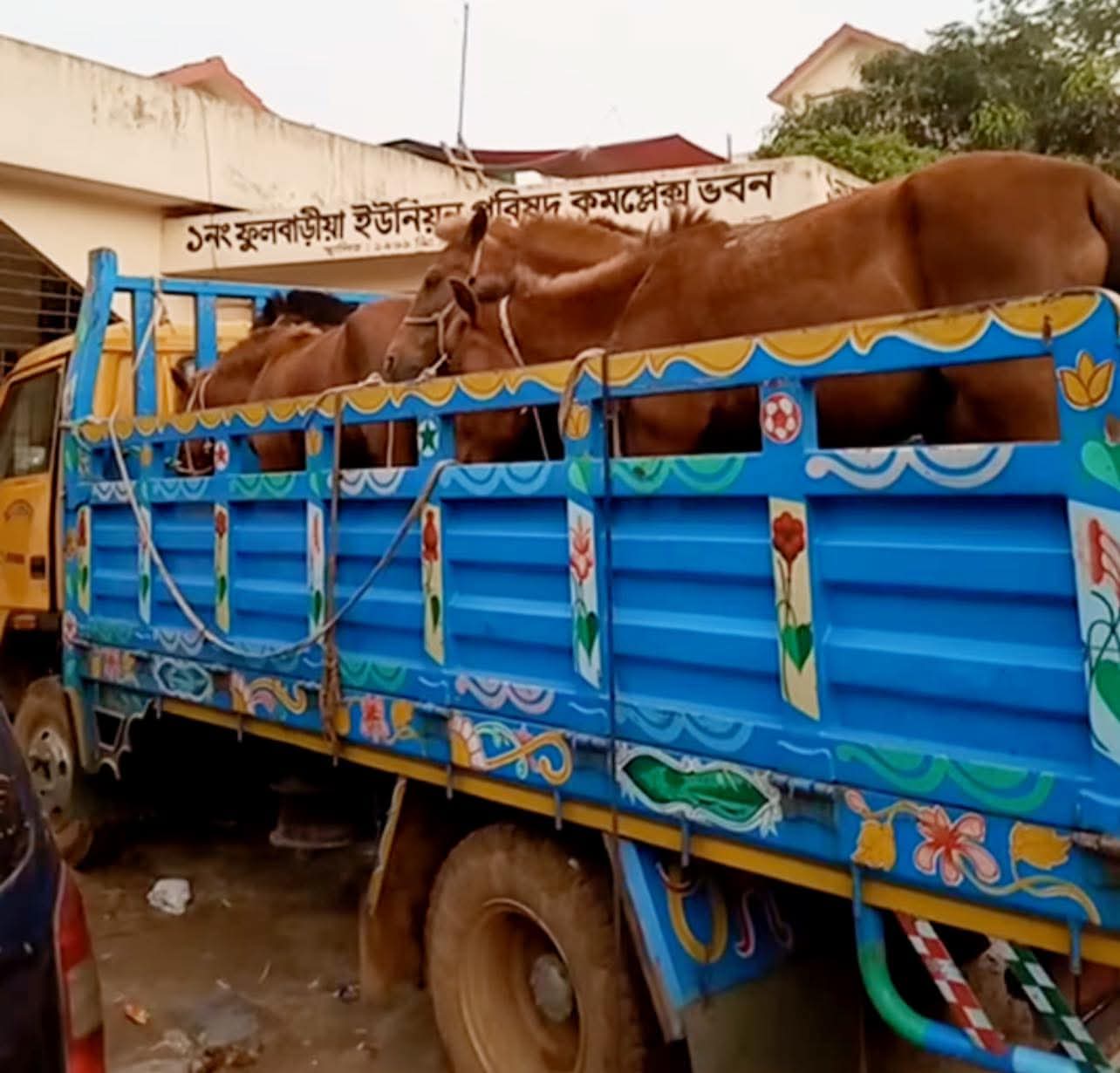 শাকিল হোসেন,কালিয়াকৈর (গাজীপুর) প্রতিনিধিঃ গাজীপুরের কালিয়াকৈর উপজেলার ফুলবাড়িয়া এলাকার একটি জঙ্গল থেকে ৯টি ঘোড়া উদ্ধার করেছে পুলিশ। এ সময় একটি ট্রাক ও একটি প্রোবক্স প্রাইভেটকার (নম্বর: ঢাকা মেট্রো-খ ১২-৬৮১০) জব্দ করা হয়। ঘোড়া জবাইয়ের প্রস্তুতিকালে ৫ জনকে আটক করা হয়েছে।