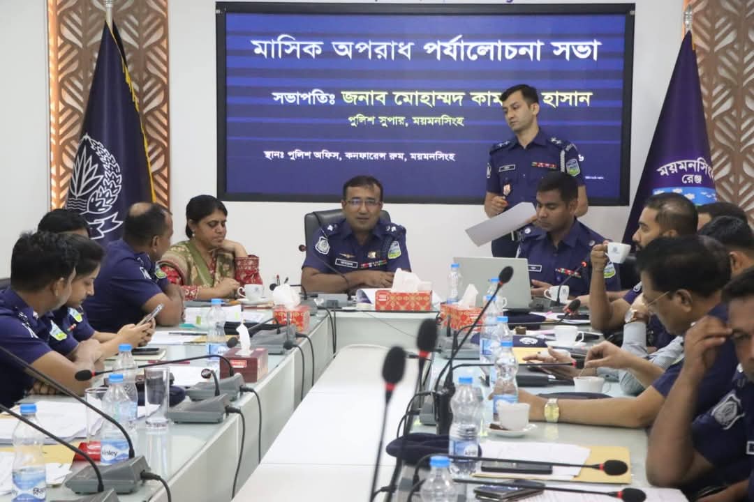 কল্যাণ সভা শেষে দুপুর ১৩:০০ ঘটিকায় পুলিশ সুপারের কার্যালয়ের সম্মেলন কক্ষে ফেব্রুয়ারি/২০২৬ মাসের মাসিক অপরাধ পর্যালোচনা সভা অনুষ্ঠিত হয়। ময়মনসিংহ জেলার পুলিশ সুপার মোহাম্মদ কামরুল হাসান।সভাপতিত্বে অপরাধ পর্যালোচনা সভায় তিনি জেলার সার্বিক আইন-শৃঙ্খলা পরিস্থিতি স্বাভাবিক রাখাসহ অপরাধ নিয়ন্ত্রণ এবং প্রতিরোধে সর্বোচ্চ পেশাদারিত্ব ও আন্তরিকতা নিয়ে কাজ করার নির্দেশ প্রদান করেন। এছাড়াও জেলার বর্তমান আইন-শৃঙ্খলা পরিস্থিতি, মাদক উদ্ধার, জেলার মূলতবি মামলা, গ্রেফতারি পরোয়ানা নিষ্পত্তি, স্পর্শকাতর মামলা সমূহের অগ্রগতি নিয়ে আলোচনা করা হয়। মাসিক অপরাধ পর্যালোচনা সভায় জেলা পুলিশ, ময়মনসিংহ এর উর্ধ্বতন কর্মকর্তাবৃন্দসহ বিভিন্ন পদমর্যাদার পুলিশ সদস্যবৃন্দ উপস্থিত ছিলেন।