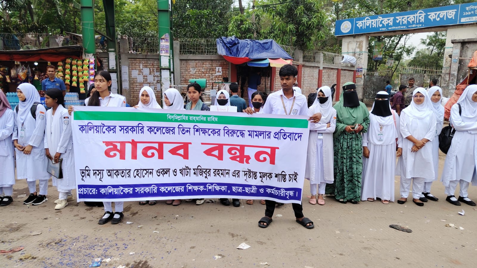 মানববন্ধনে অংশগ্রহণকারীরা অভিযোগ করেন, সম্প্রতি কলেজের আওতাধীন জমিতে একটি মসজিদ নির্মাণের উদ্যোগ নেয় কলেজ কর্তৃপক্ষ। এ সময় স্থানীয়ভাবে ভূমিদস্যু হিসেবে পরিচিত আকতার হোসেন ওকল ও খাটা মজিবুর রহমান উক্ত জমি নিজেদের দাবি করে নির্মাণ কাজে বাধা প্রদান করেন। পরবর্তীতে তারা আদালতে কলেজের তিন শিক্ষকের বিরুদ্ধে মামলা দায়ের করেন।