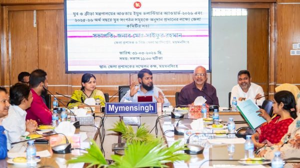 মকবুল হোসেন,ময়মনসিংহ জেলা প্রতিনিধি :ময়মনসিংহে যুব ও ক্রীড়া মন্ত্রণালয়ের আওতায় ইয়ুথ ভলান্টিয়ার অ্যাওয়ার্ড-২০২৬ প্রদান এবং ২০২৫-২৬ অর্থবছরে যুব সংগঠনসমূহকে অনুদান প্রদান সংক্রান্ত জেলা কমিটির সভা অনুষ্ঠিত হয়েছে।