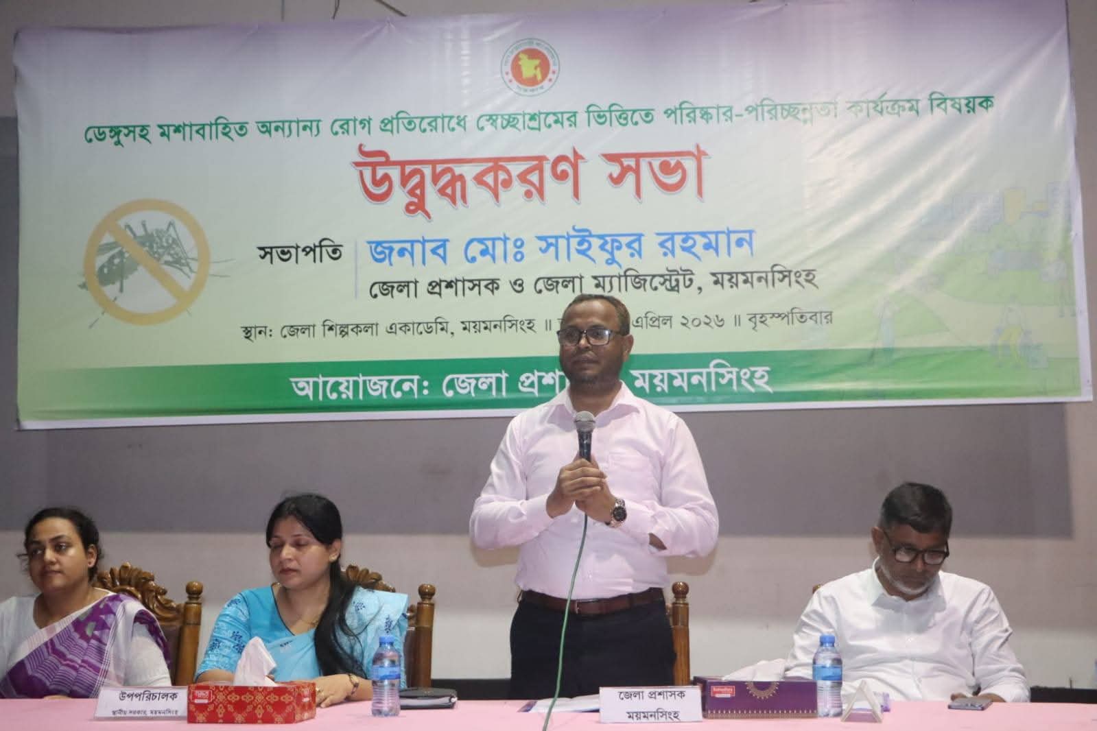 মকবুল হোসেন,ময়মনসিংহ জেলা প্রতিনিধি :ময়মনসিংহ জেলা প্রশাসন,কর্তৃক আয়োজিত ডেঙ্গুসহ মশাবাহিত অন্যান্য রোগ প্রতিরোধে স্বেচ্ছাশ্রমের ভিত্তিতে পরিষ্কার-পরিচ্ছন্নতা কার্যক্রম বিষয়ক উদ্বুদ্ধকরণ সভা অনুষ্ঠিত হয়। আজ ০২এপ্রিল বৃহস্পতিবার বিকেল ৪:০০ ঘটিকায় ময়মনসিংহ জেলা শিল্পকলা একাডেমি অনুষ্ঠিত হয়।