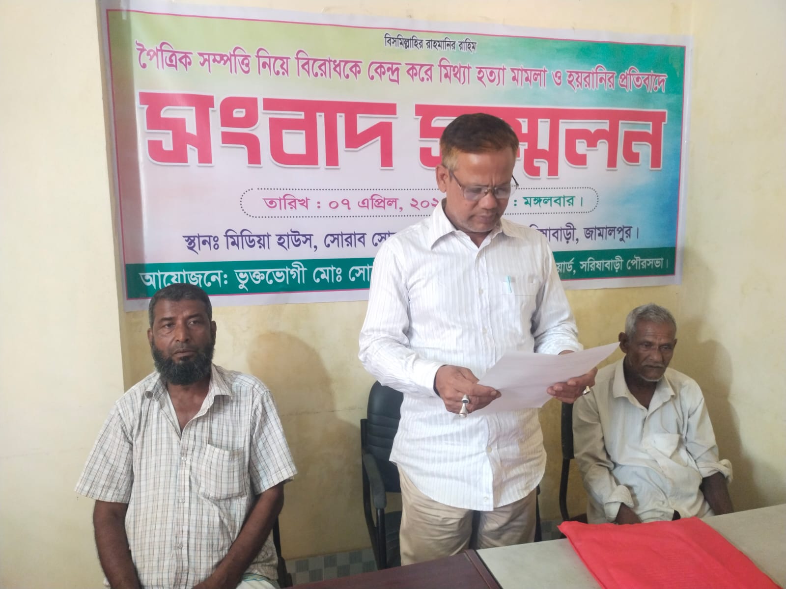 সরিষাবাড়ী (জামালপুর) প্রতিনিধি: জামালপুরের সরিষাবাড়ী পৌরসভার সামর্থবাড়ী গ্রামে পৈত্রিক সম্পত্তি সংক্রান্ত বিরোধকে কেন্দ্র করে সড়ক দুর্ঘটনায় মৃত্যুর ঘটনাকে ‘হত্যাকাণ্ড’ হিসেবে উপস্থাপন করে মিথ্যা মামলা দায়েরের অভিযোগ উঠেছে। এ ঘটনায় নিজেকে ষড়যন্ত্রের শিকার দাবি করে সংবাদ সম্মেলন করেছেন ভুক্তভোগী সরিষাবাড়ী পৌরসভার ২নং ওয়ার্ডের সাবেক কাউন্সিলর সোহেল রানা। এ ঘটনায় মঙ্গলবার (৭ এপ্রিল) সকাল ১১টায় সরিষাবাড়ীর মিডিয়া হাউজ সোরাব সোহেল ভবনের ৩য় তলায় আয়োজিত সংবাদ সম্মেলনে লিখিত বক্তব্যে তিনি এসব অভিযোগ তুলে ধরেন।