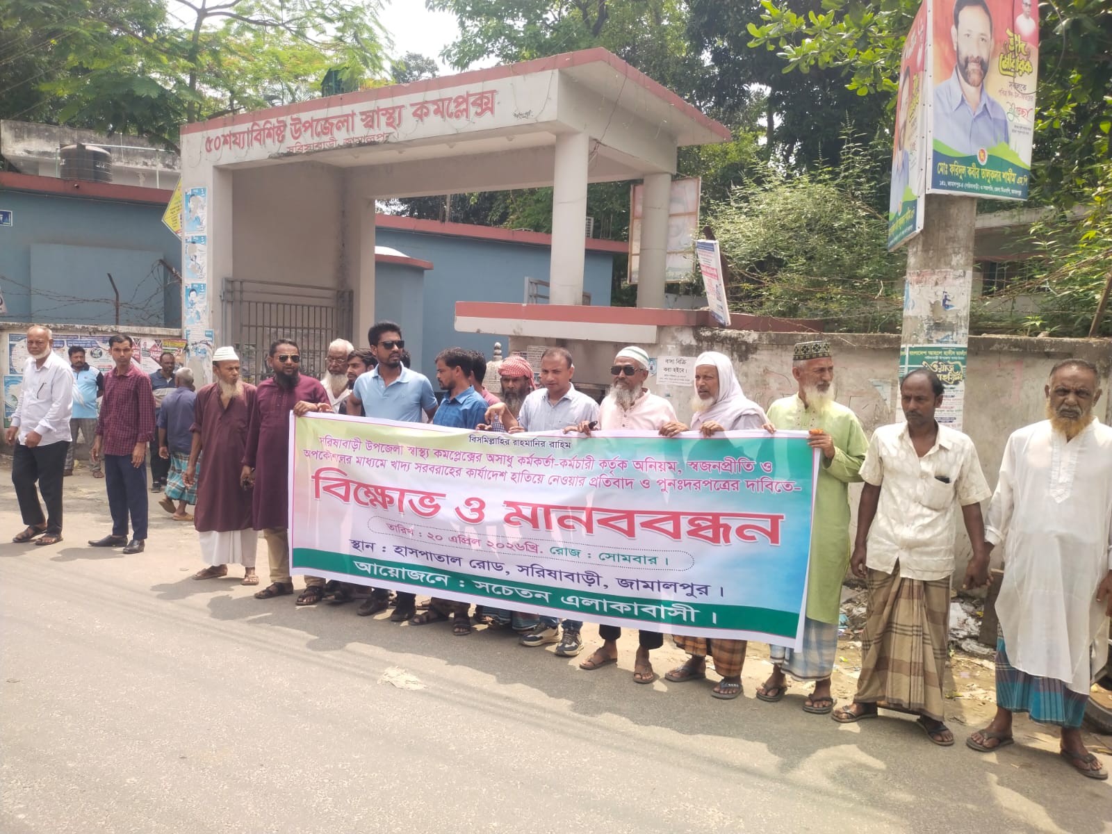 সরিষাবাড়ী স্বাস্থ্য কমপ্লেক্সে খাদ্য সরবরাহের ঠিকাদার নিয়োগে পুনঃদরপত্রের দাবিতে মানববন্ধন কর্মসূচি পালিত